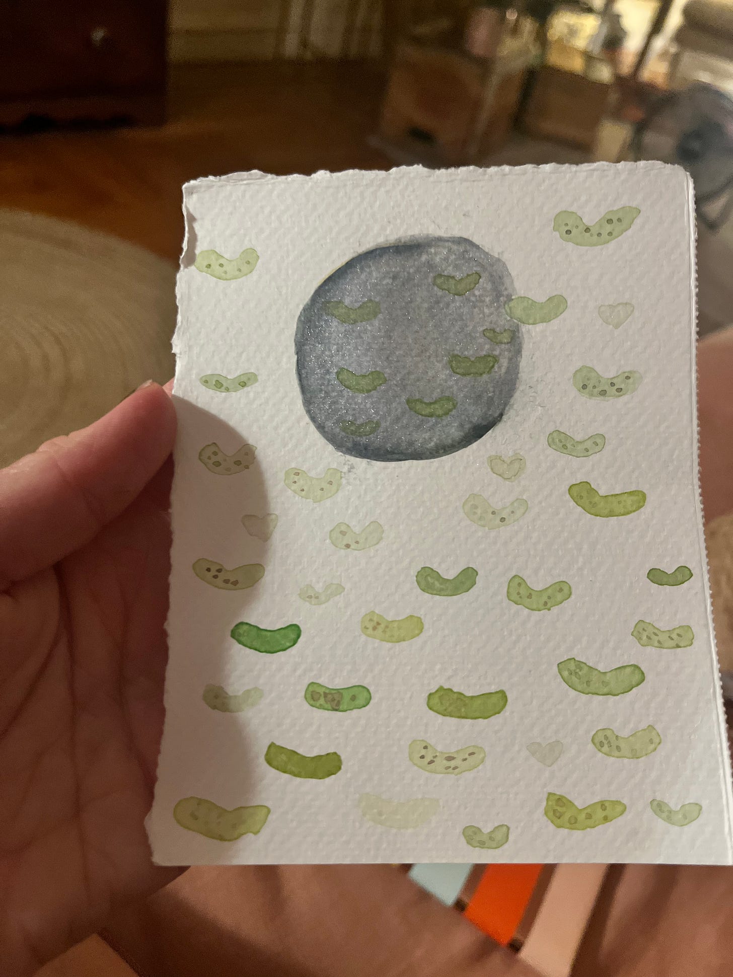After everyone went home, I sat on my bed reading through cards and opening treats, feeling so moved and grateful for the people in my life. My friend Katie watercolored this card with two of my favorite things- the moon and pickles :)