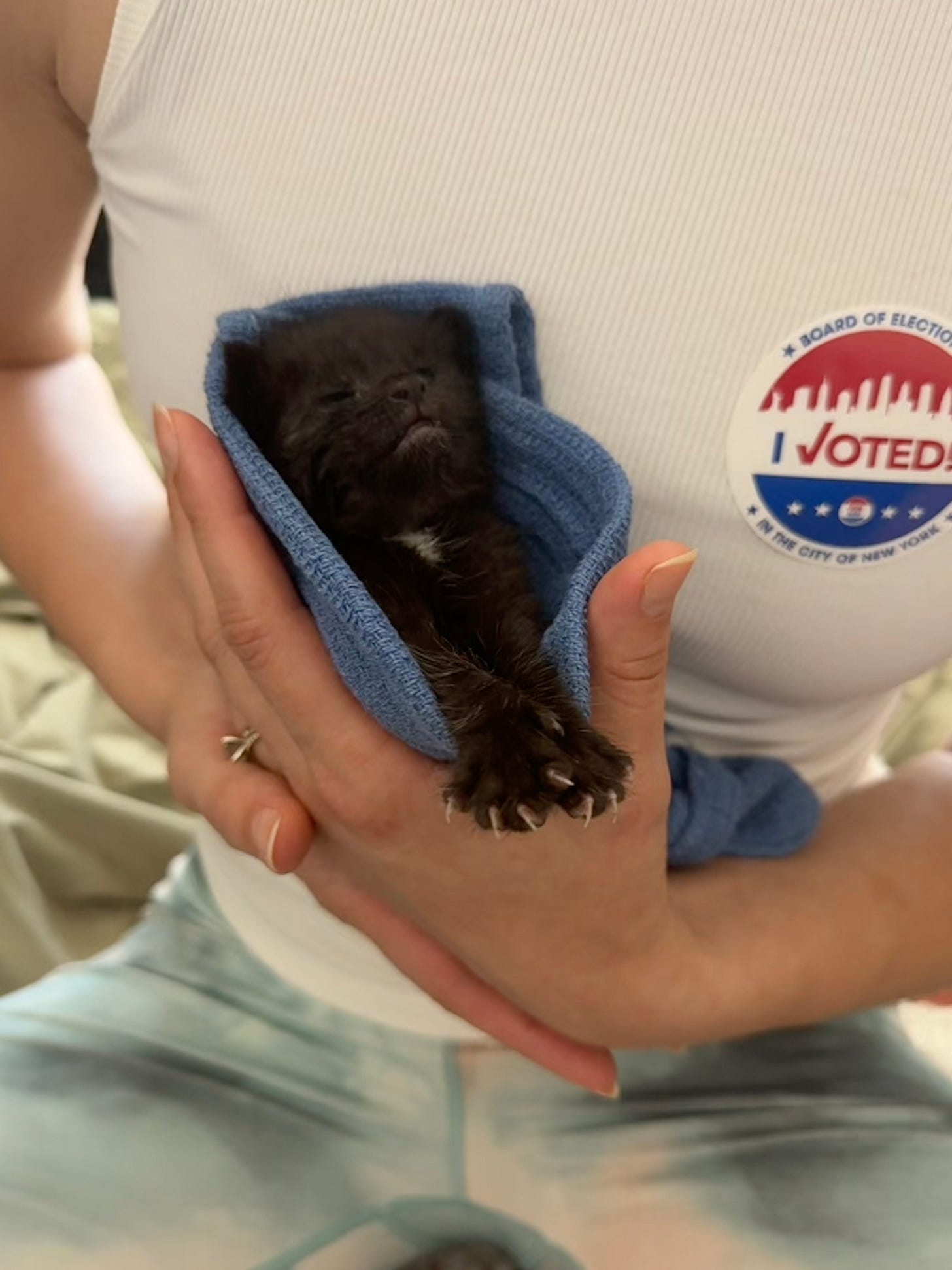 The good news is, bb kit is doing well and has a foster secured. This morning Kira sent us a video of her holding it wrapped in what appears to be a blue dish towel, its tiny mouth open and closing in the most gorgeous high-pitched squeals, every whine a battle cry, as if willing itself to live, live, live, live.