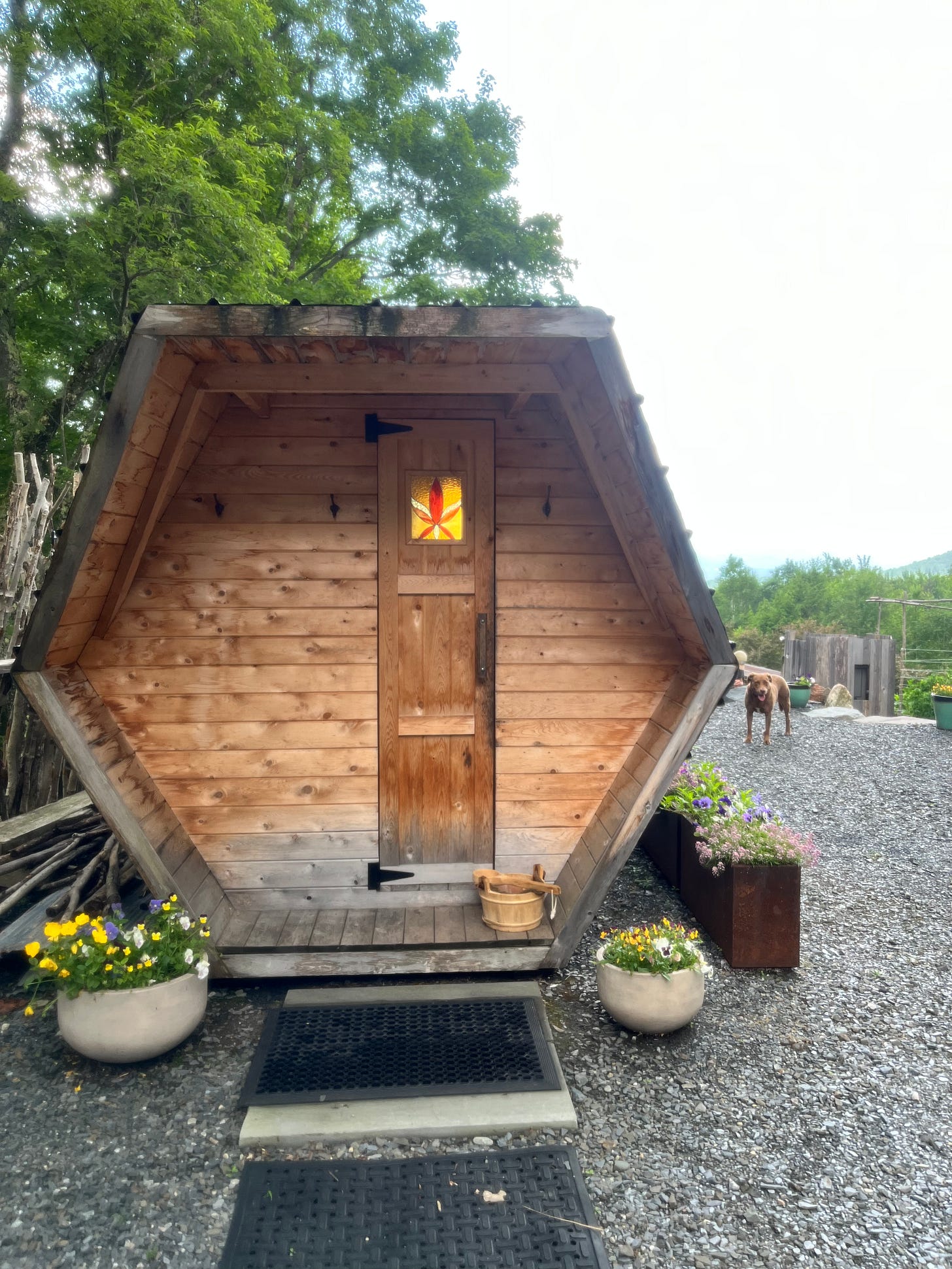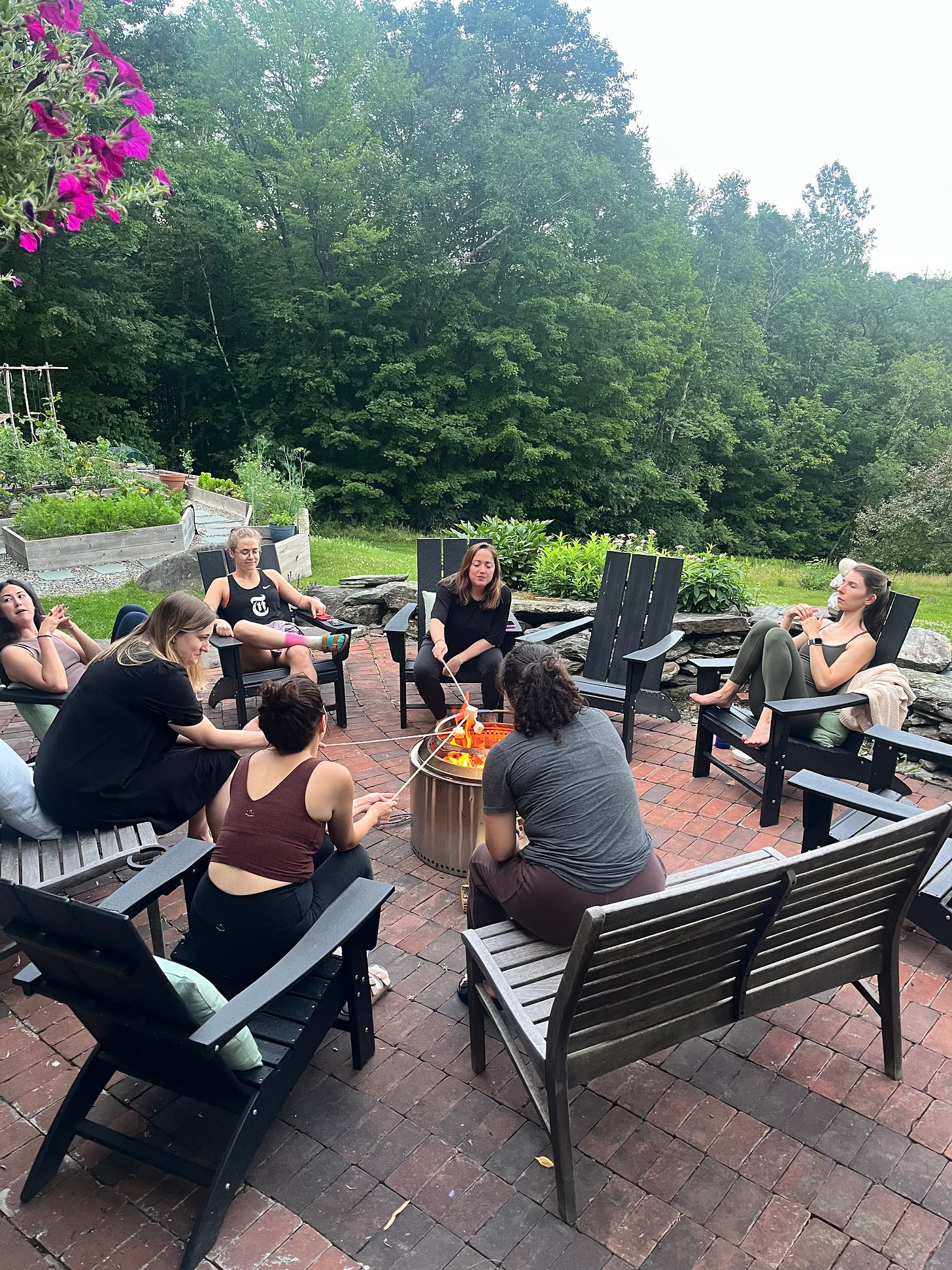 In addition to 90 minute yoga practices, we spent the weekend eating food from the garden, sitting around the campfire making s’mores, sauna-ing, cold plunging, wood-fired hot tubbing, and mostly just vegging out in the serene space. I loved watching people stare at the sky from a rocking chair, or doodle in a coloring book on the deep leather couches. On Friday night, a local sound bath practitioner with fairy energy led us in a gorgeous session, the one class I participated in instead of leading, which was lovely.
