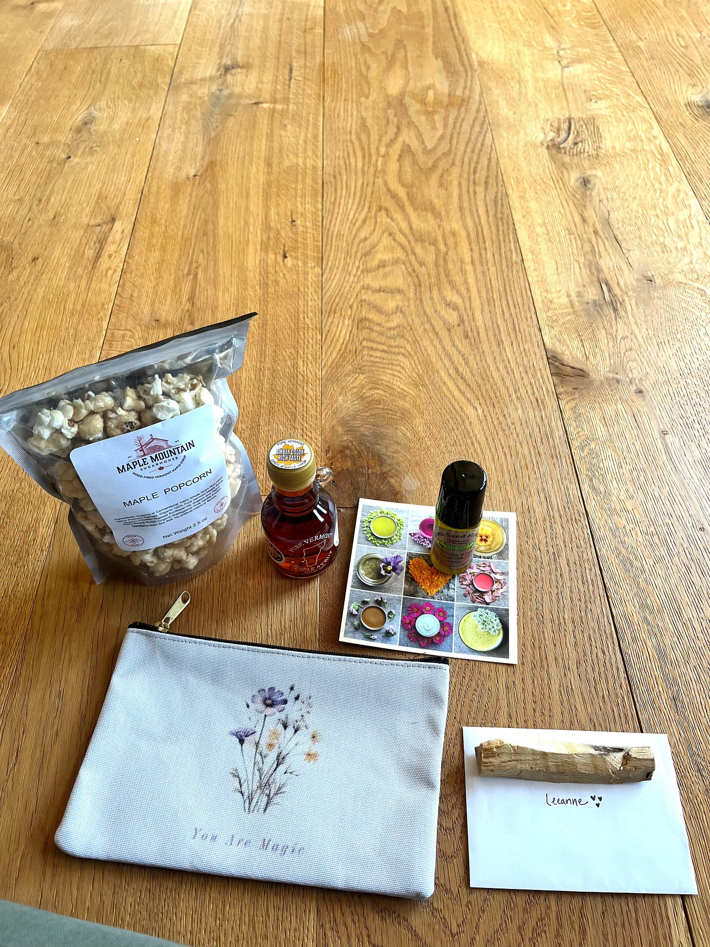 Gift bags! I went very local this time and worked with an herbalist who made body oil roll-ons for the group, as well as a maple syrup factory for local bottles and popcorn. Each pouch reminds my students of what I always think, and of course, a handwritten letter and palo santo for juju.